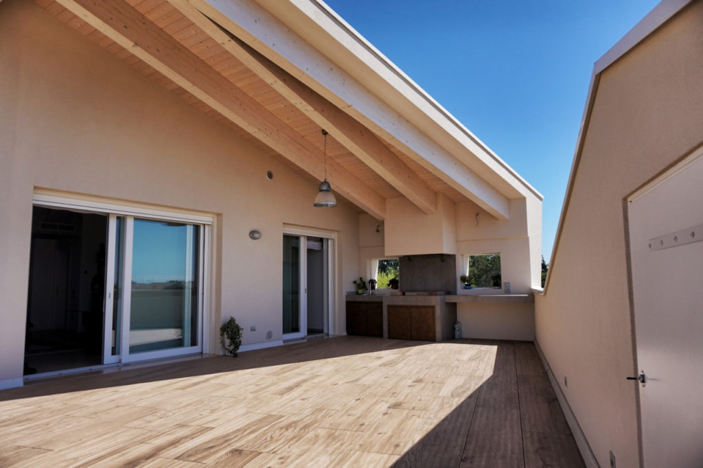 Terrazza, loggia, travatura a vista, caminetto esterno, sole